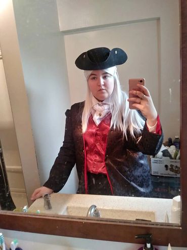 Hat: purchased off Amazon and edited to fit the pony tail on the wig. Attached with barrettes into the wig to keep it on my head.